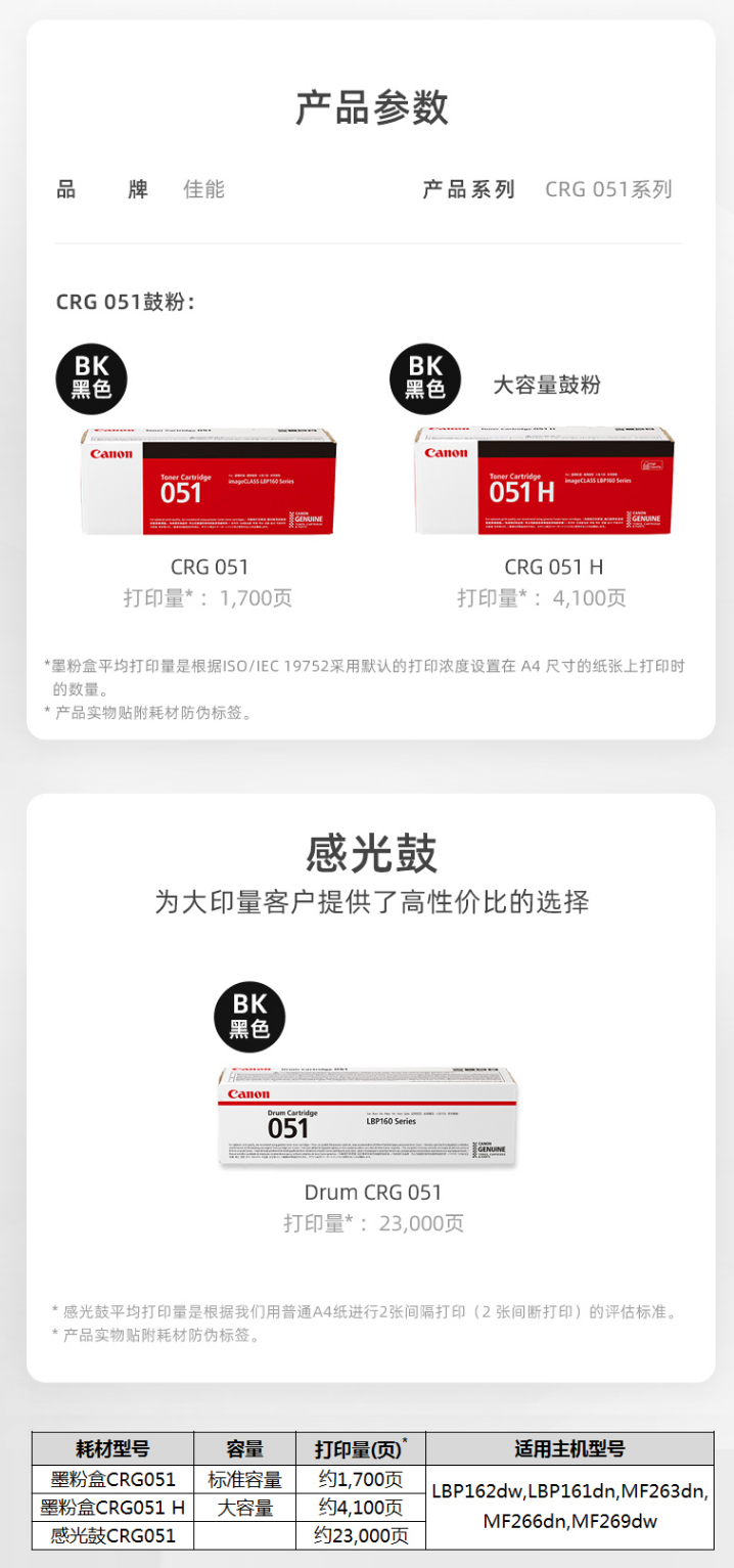 商品名称:佳能(Canon)墨粉盒CRG051 H黑色大容量 粉盒 碳粉 CRG051H(适用LBP162dw/LBP161dn/MF263dn/MF266dn/MF269dw)