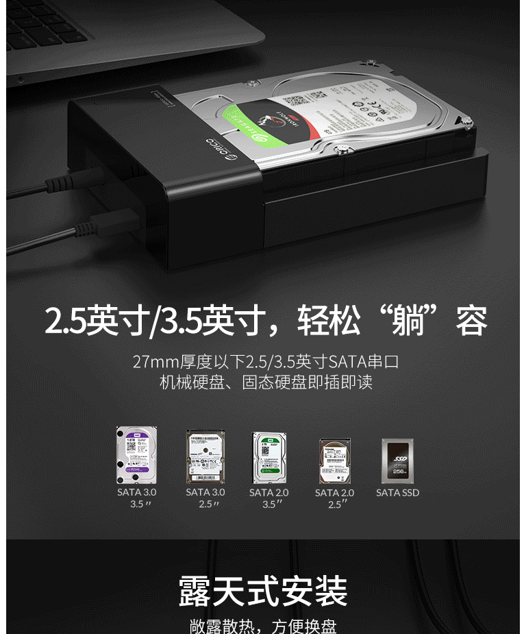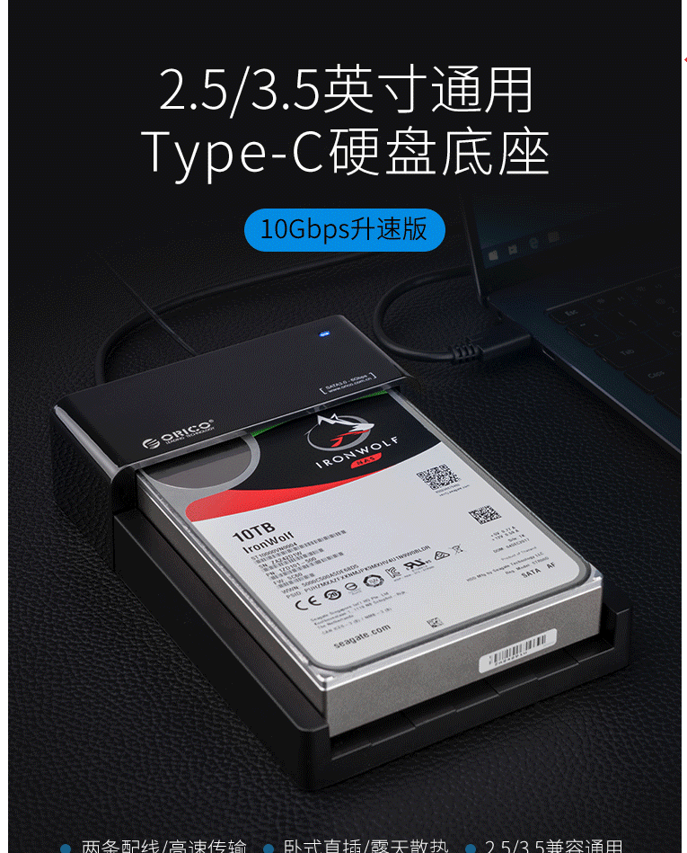 奥睿科(ORICO)移动硬盘盒底座Type-C接口2.5/3.5英寸SATA串口SSD固态机械通用外置盒10Gbps 6518C3-G2