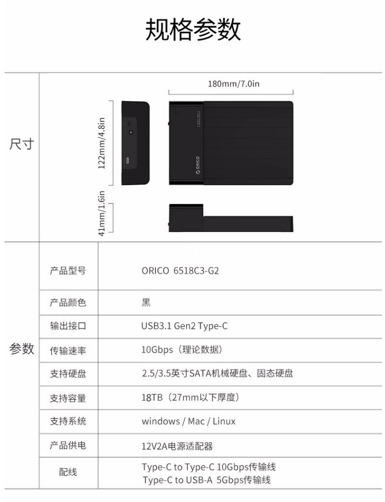 商品名称:奥睿科(ORICO)移动硬盘盒底座Type-C接口2.5/3.5英寸SATA串口SSD固态机械通用外置盒10Gbps 6518C3-G2