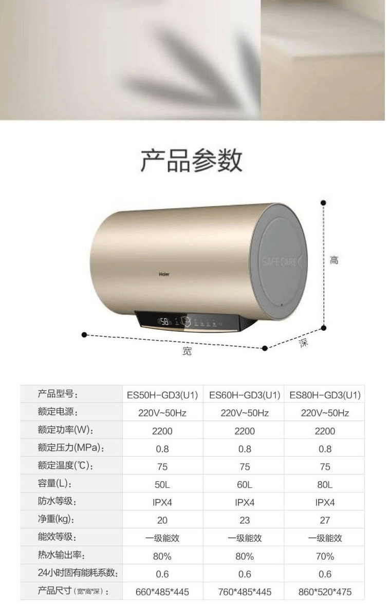 商品名称:海尔(Haier)ES80H-GD3(U1)80升一级能效储水式电热水器