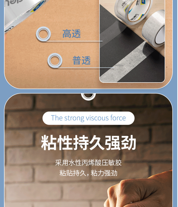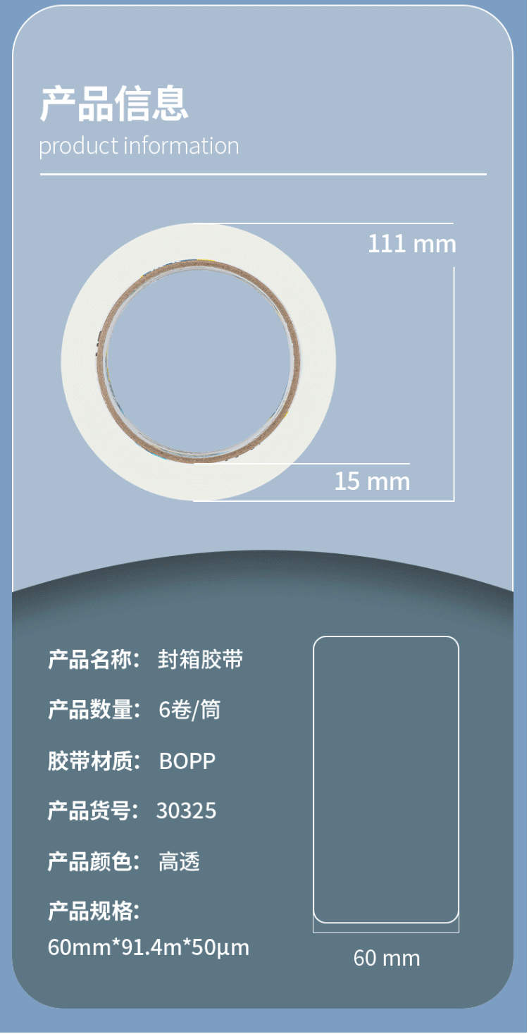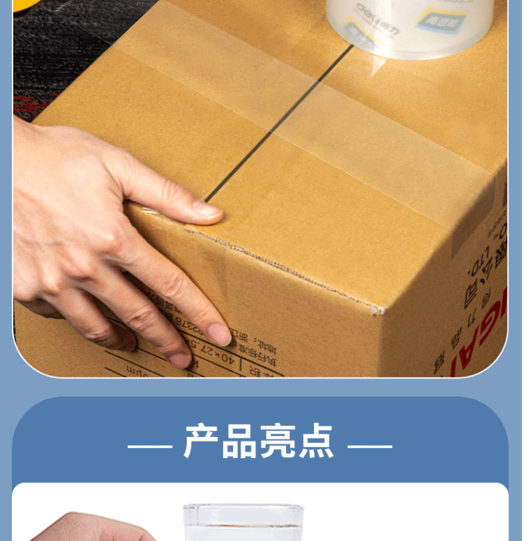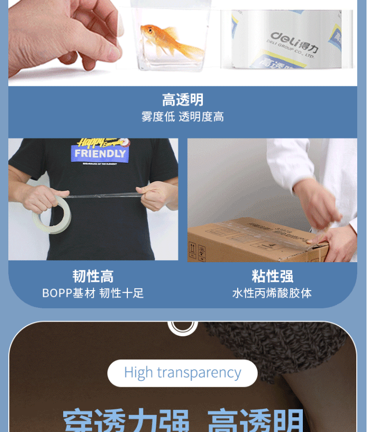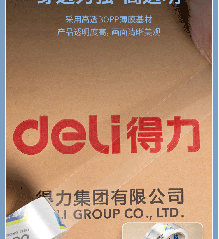 商品名称:得力(deli)高透明封箱胶带 打包胶带 60mm*100y*50um(91.4m/卷) 30325