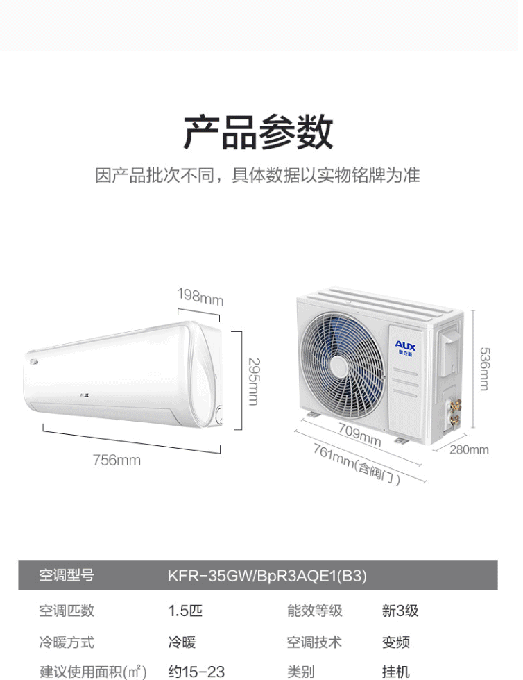 商品名称:奥克斯(AUX) 空调 1.5匹变频挂壁式空调(KFR-35GW/BpR3AQE1(B3))(含安装)