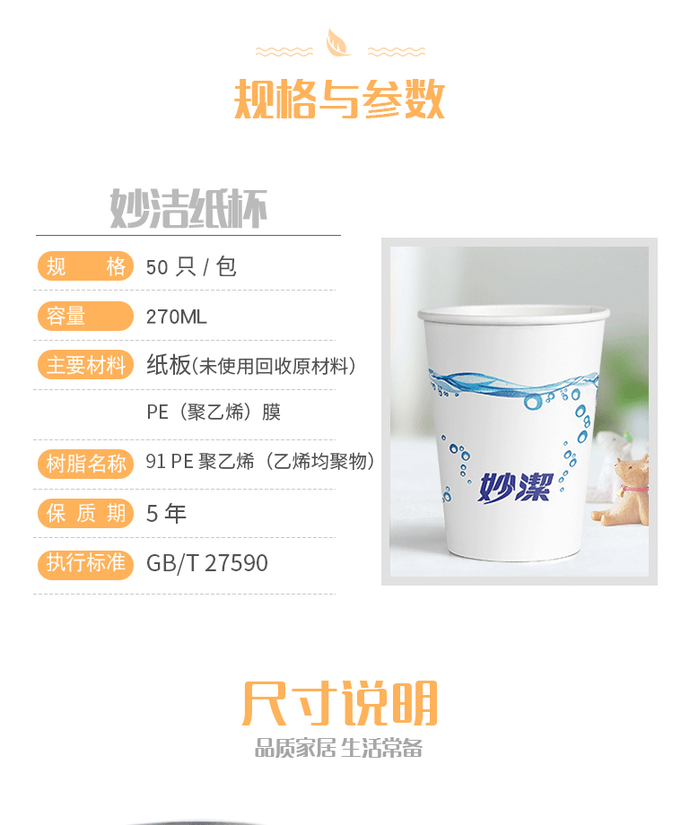 商品名称:妙洁 增厚纸杯 中号270ml 一次性杯子 50只*40包/箱
