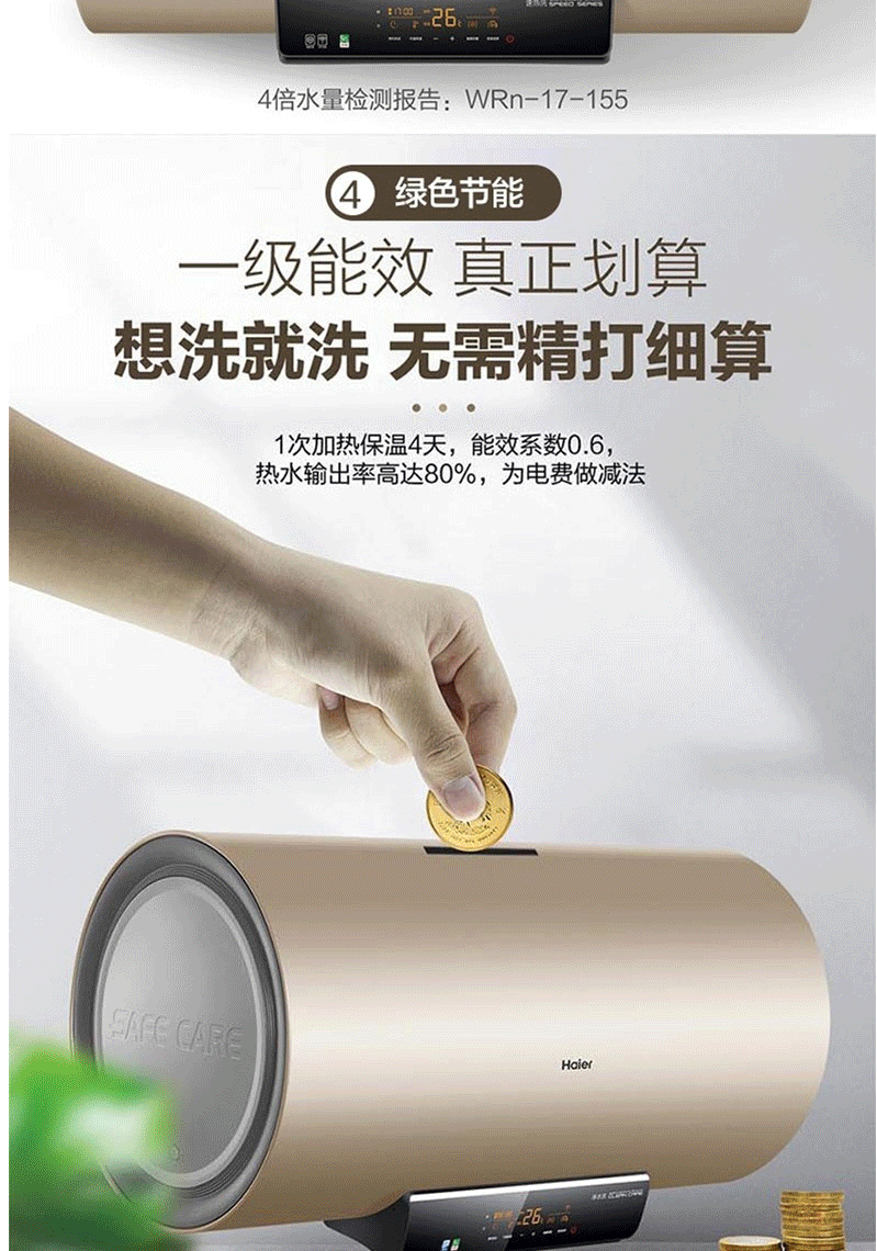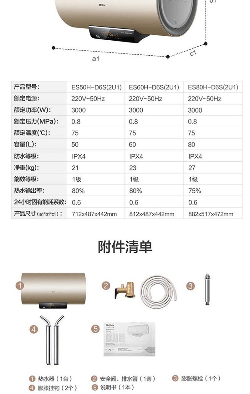 商品名称:海尔(Haier) 热水器50升 大功率速热大水量 一级能效 ES50H-D6S(2U1)(含安装)