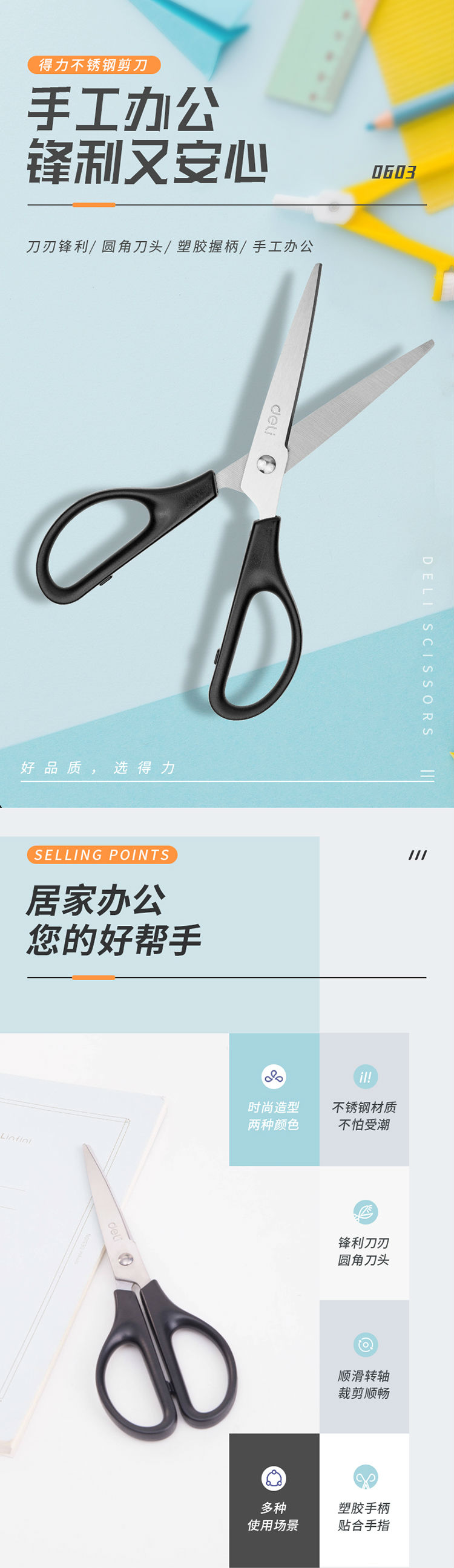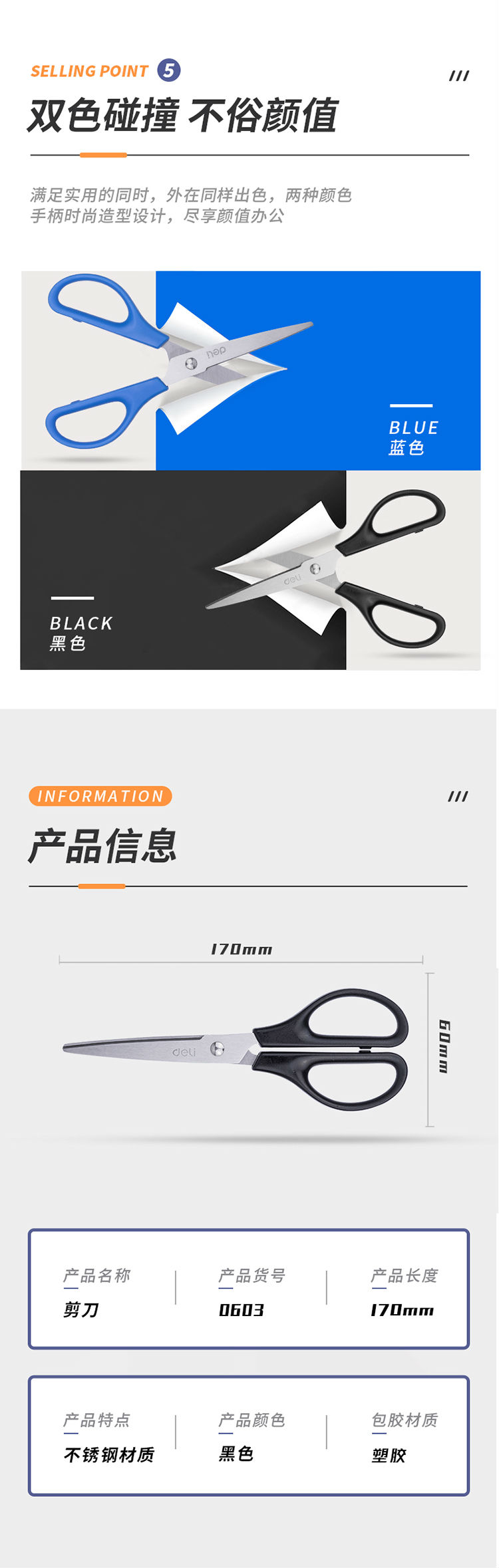 商品名称:得力(deli)170mm办公剪刀 1把 办公用品 0603黑色