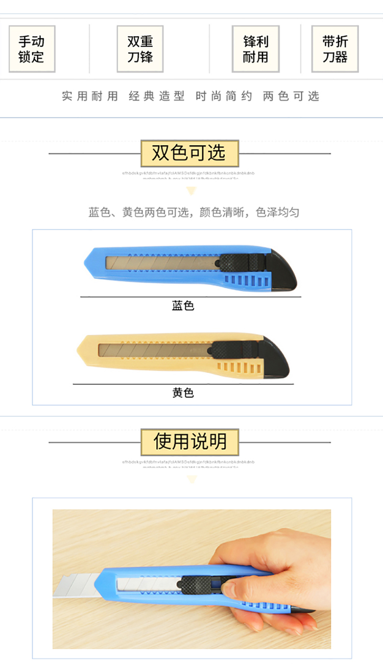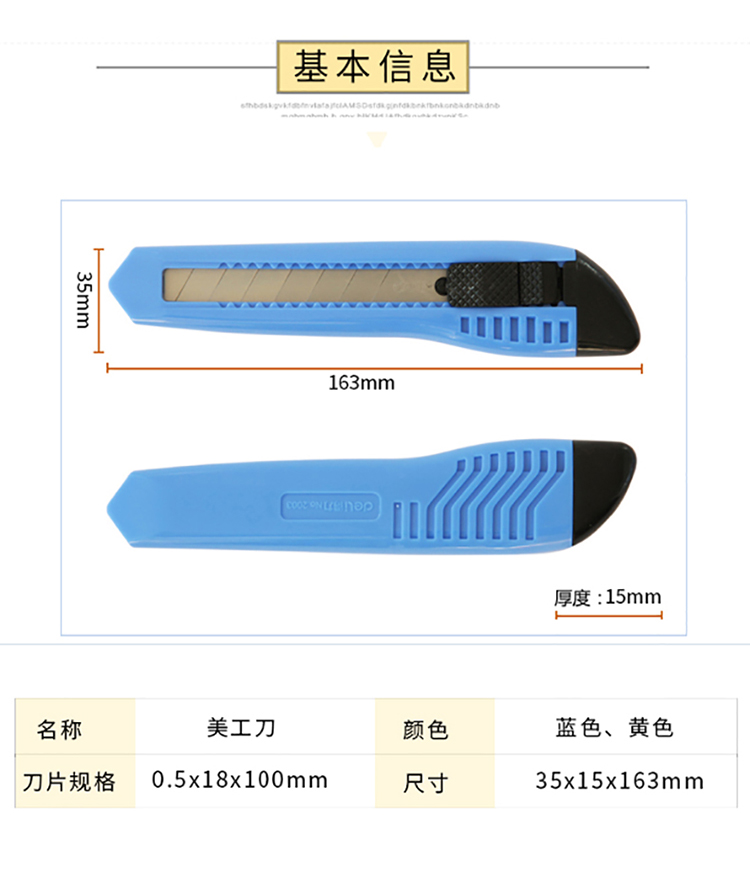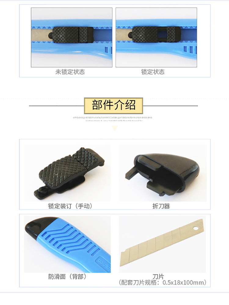 商品名称:得力(deli)大号耐用美工刀 手动锁定功能裁纸刀/壁纸刀 2003 蓝色(个)