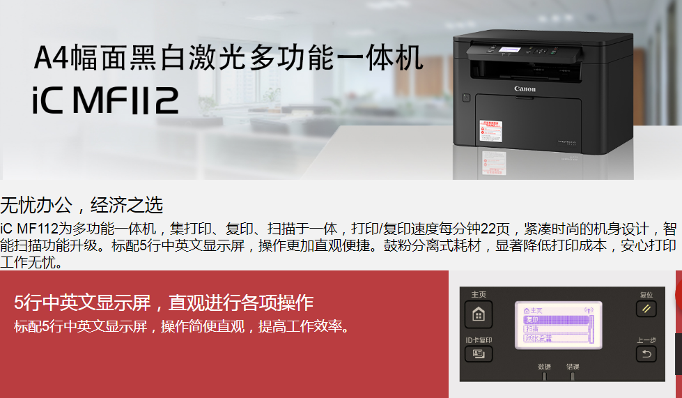 佳能(CANON)MF112 黑白激光多功能一体机 标配打印、复印、扫描三合一