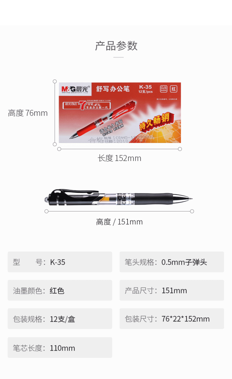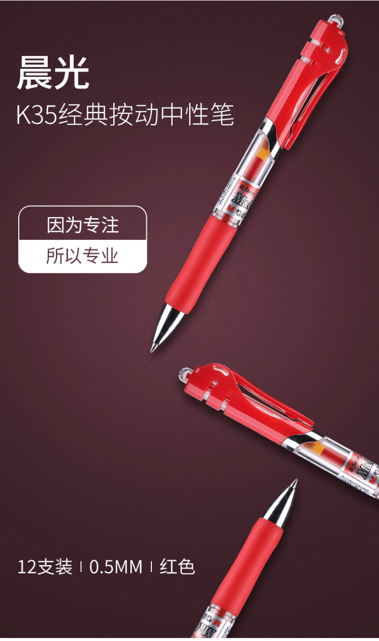 商品名称:晨光(M&G) 0.5mm中性笔 经典按动子弹头签字笔 12支/盒 K35红色