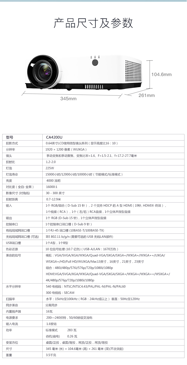 商品名称:NEC NP-CA4200U 投影仪 投影机 投影 办公(4000流明 四点几何校正 WUXGA分辨率)