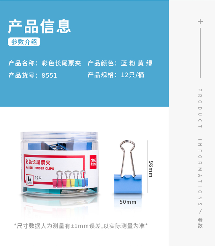 商品名称:得力(deli)50mm彩色长尾夹票夹 1#金属燕尾夹票据夹子 8551(12只/桶)