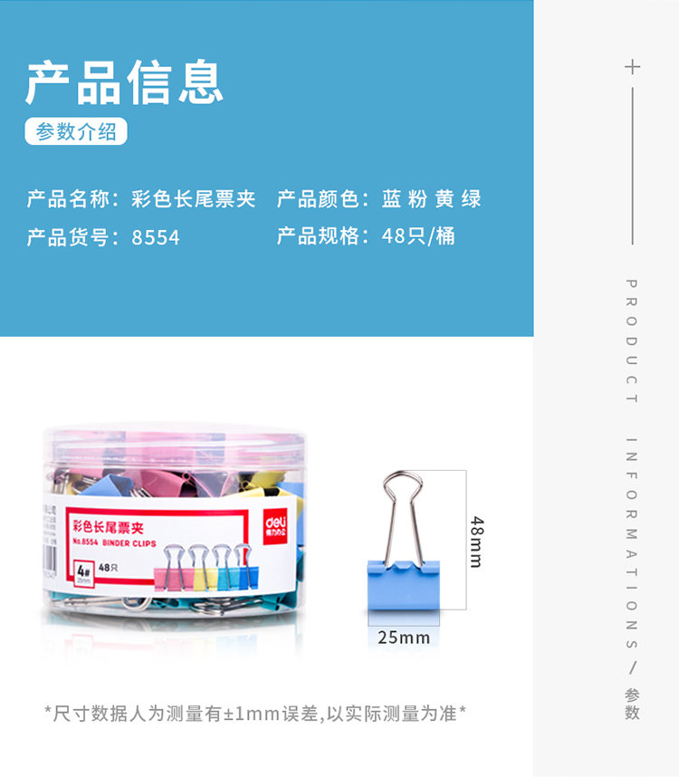 商品名称:得力(deli) 25mm彩色长尾夹票夹 4#金属燕尾夹票据夹子 8554 (48只/桶)