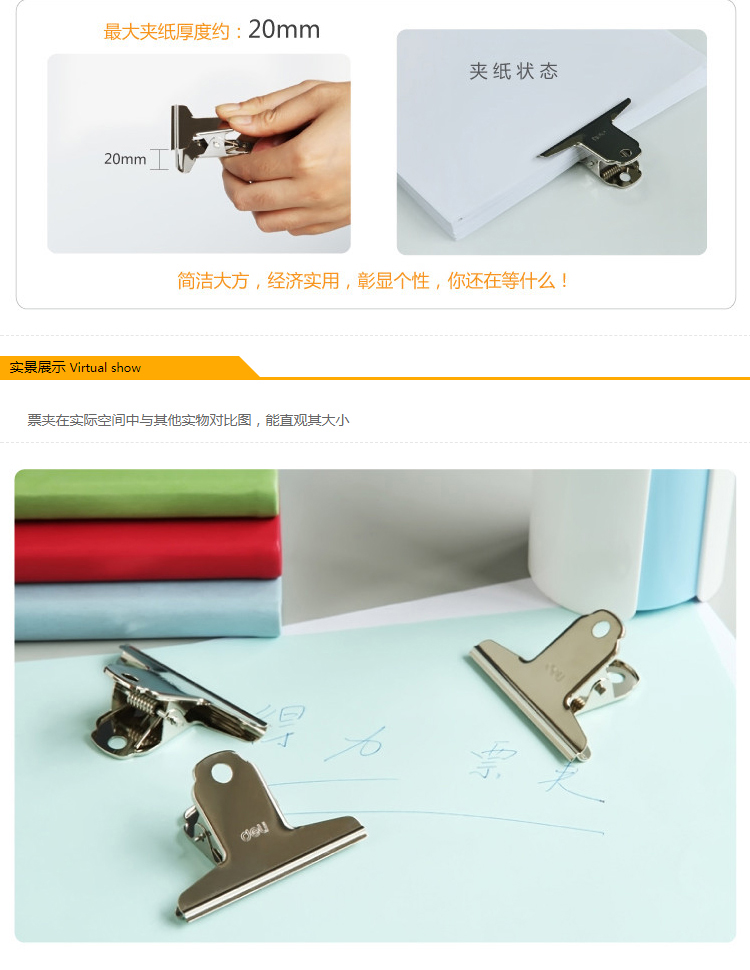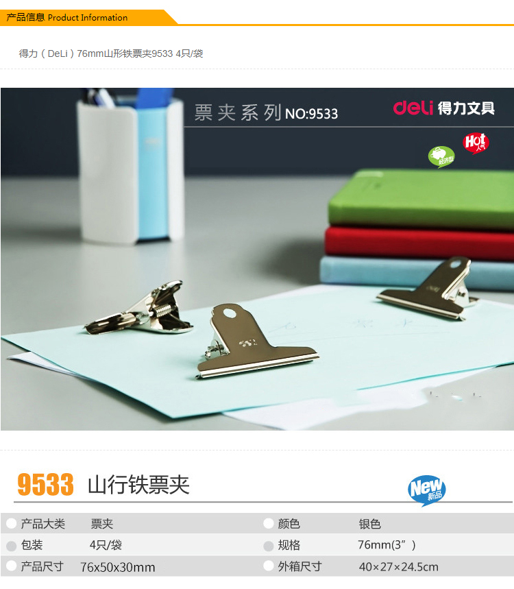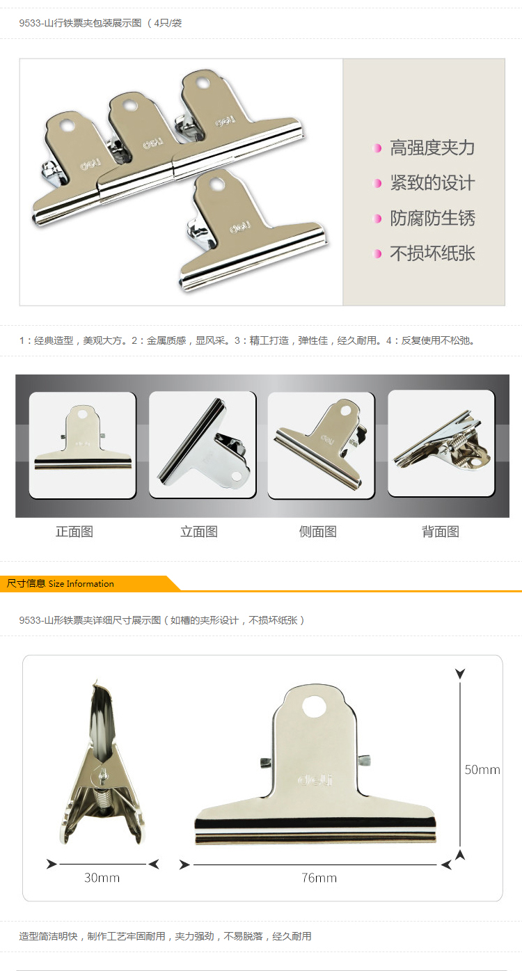 商品名称:得力(deli) 76mm山形票据票夹画板夹 财务票据夹 小号金属票据夹子 9533 (4只/包)