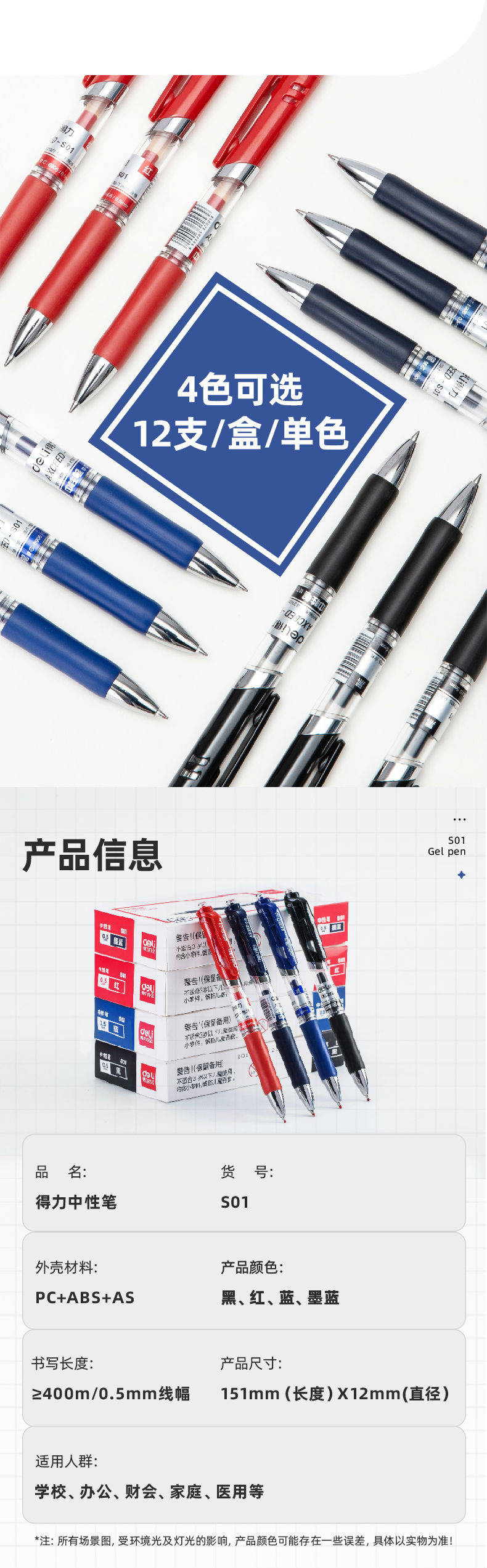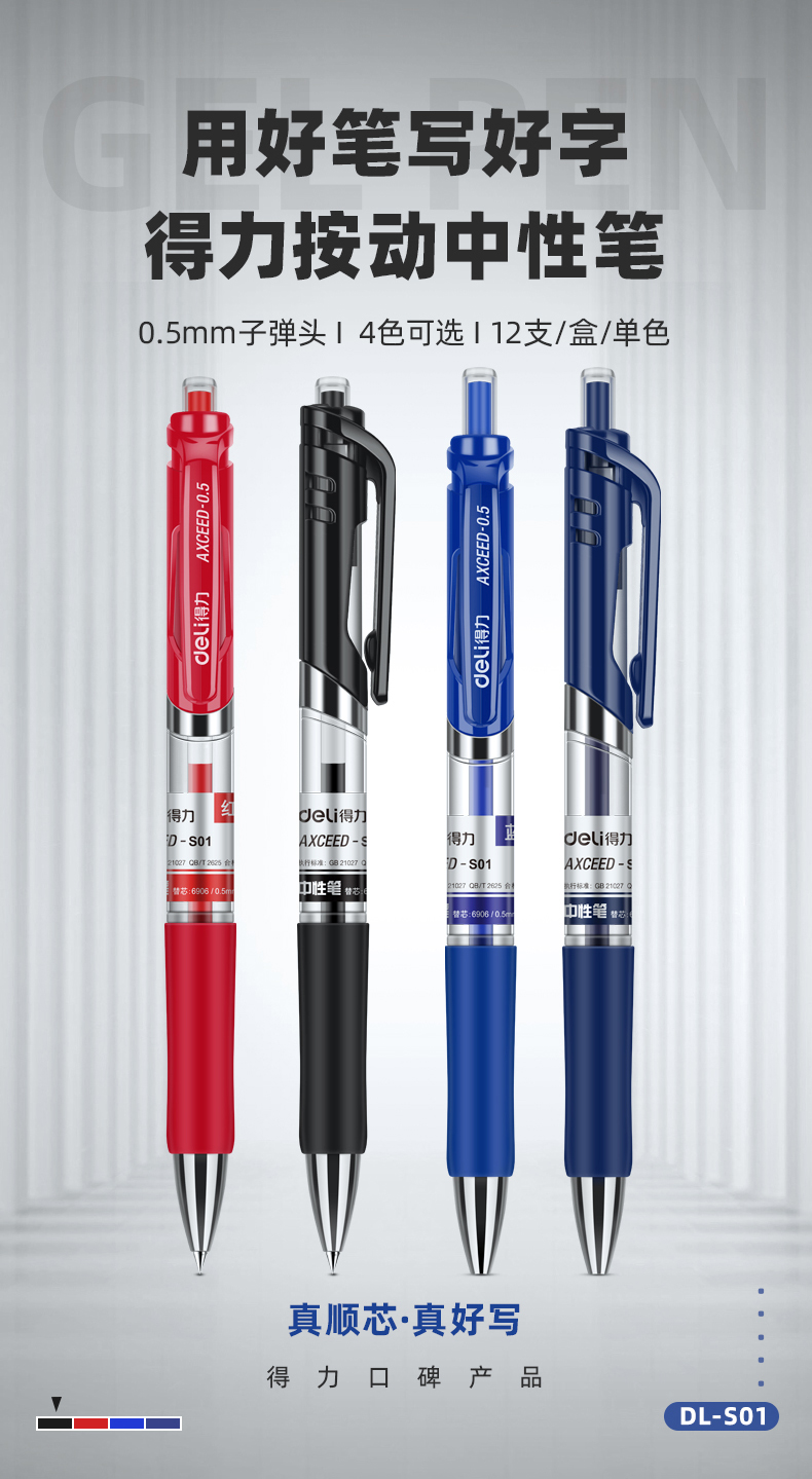 商品名称:得力S01中性笔 按动碳素笔 0.5mm弹簧头 蓝色 (单位:盒)