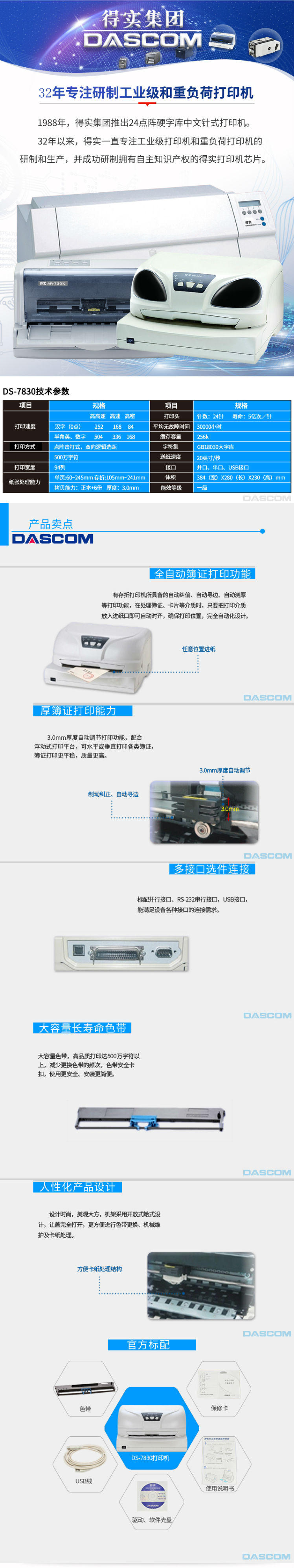 商品名称:得实(Dascom)DS-7830 24针94列 厚簿证/存折打印机