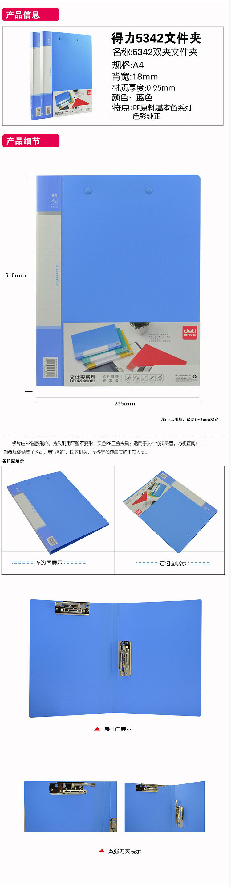 商品名称:得力5342文件夹 强力双夹 蓝色 (单位:个)
