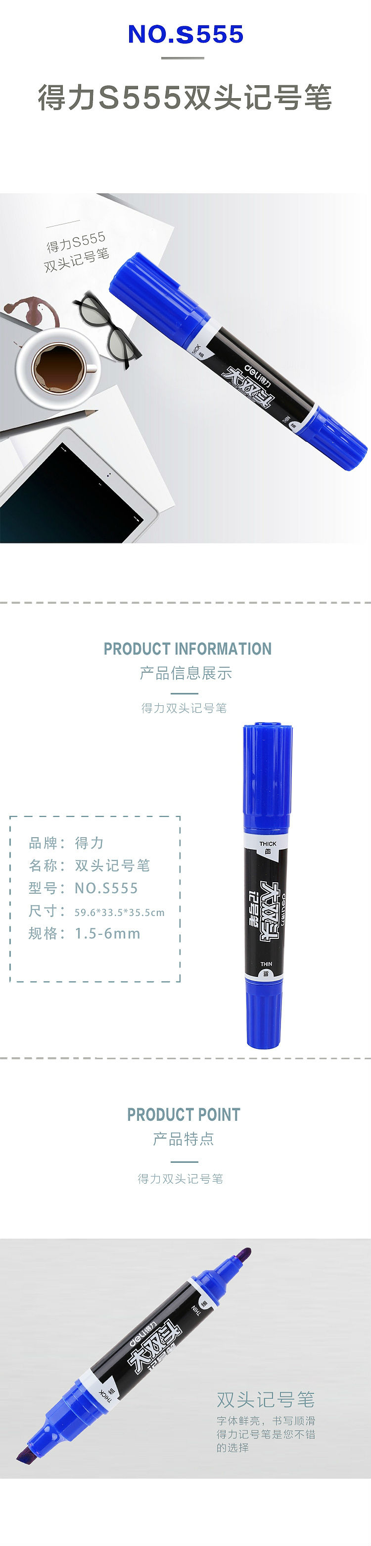 商品名称:得力 S555 大双头记号笔 1.5-6mm 蓝色(单位:支)