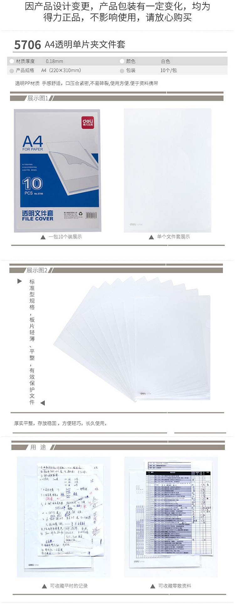商品名称:得力 5706 透明文件套 10只/包 (单位:包)