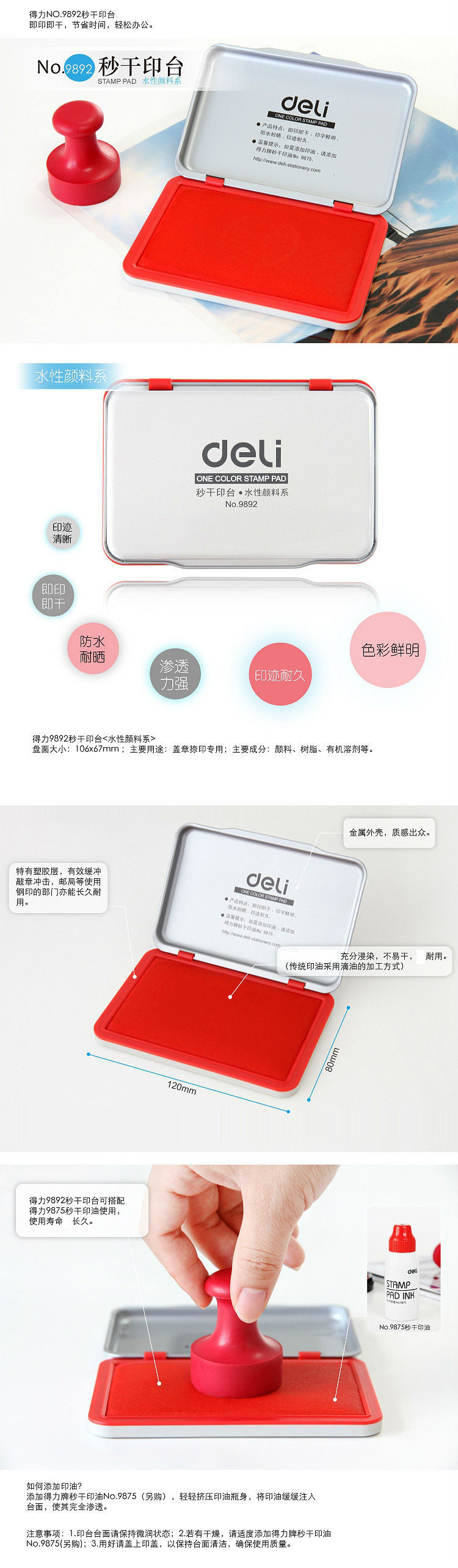 商品名称:得力(deli)金属方形 中号120*80mm秒干印台印泥 9892红色(单位:个)
