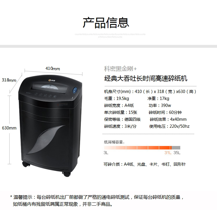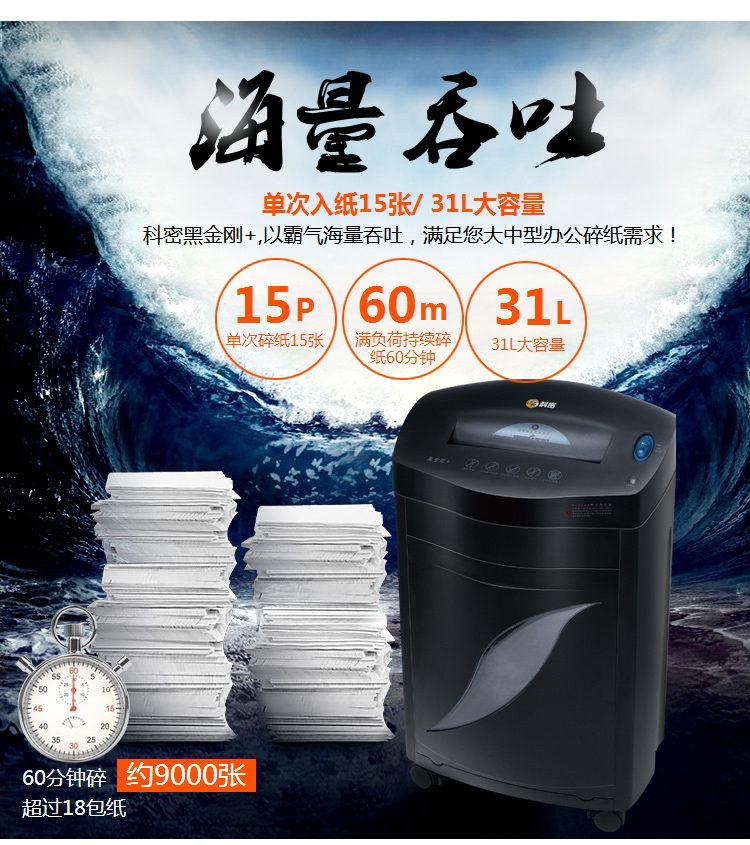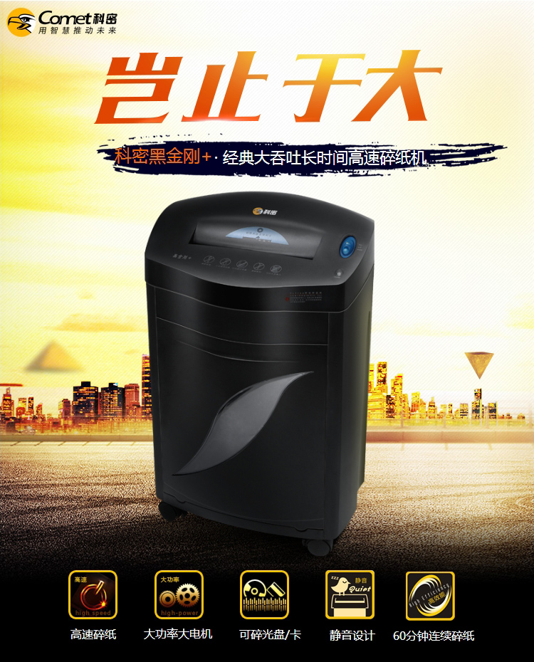 商品名称:科密(comet)黑金刚+ 31L大容量办公商用碎纸机 纸张文件卡片光盘粉碎机