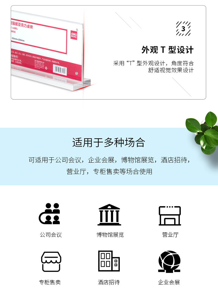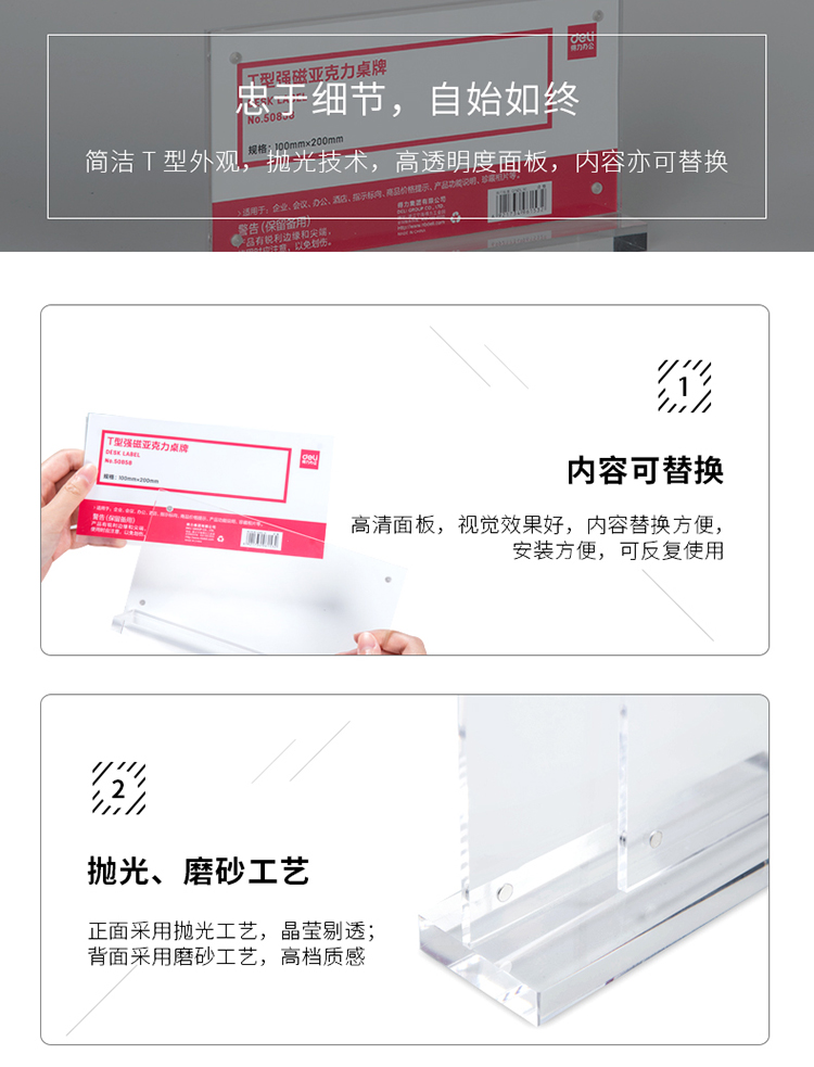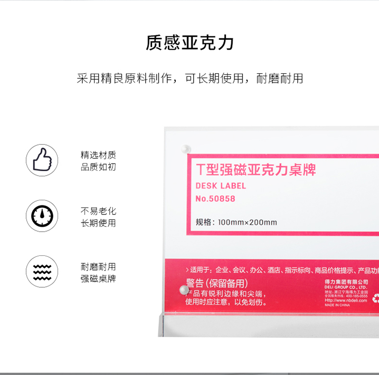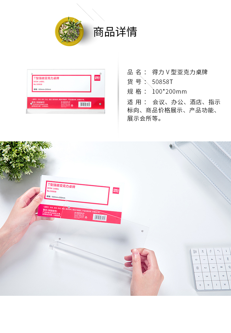 商品名称:得力(deli)100*200mm T型强磁吸附亚克力桌牌/桌牌架/台卡 单面透明 50858