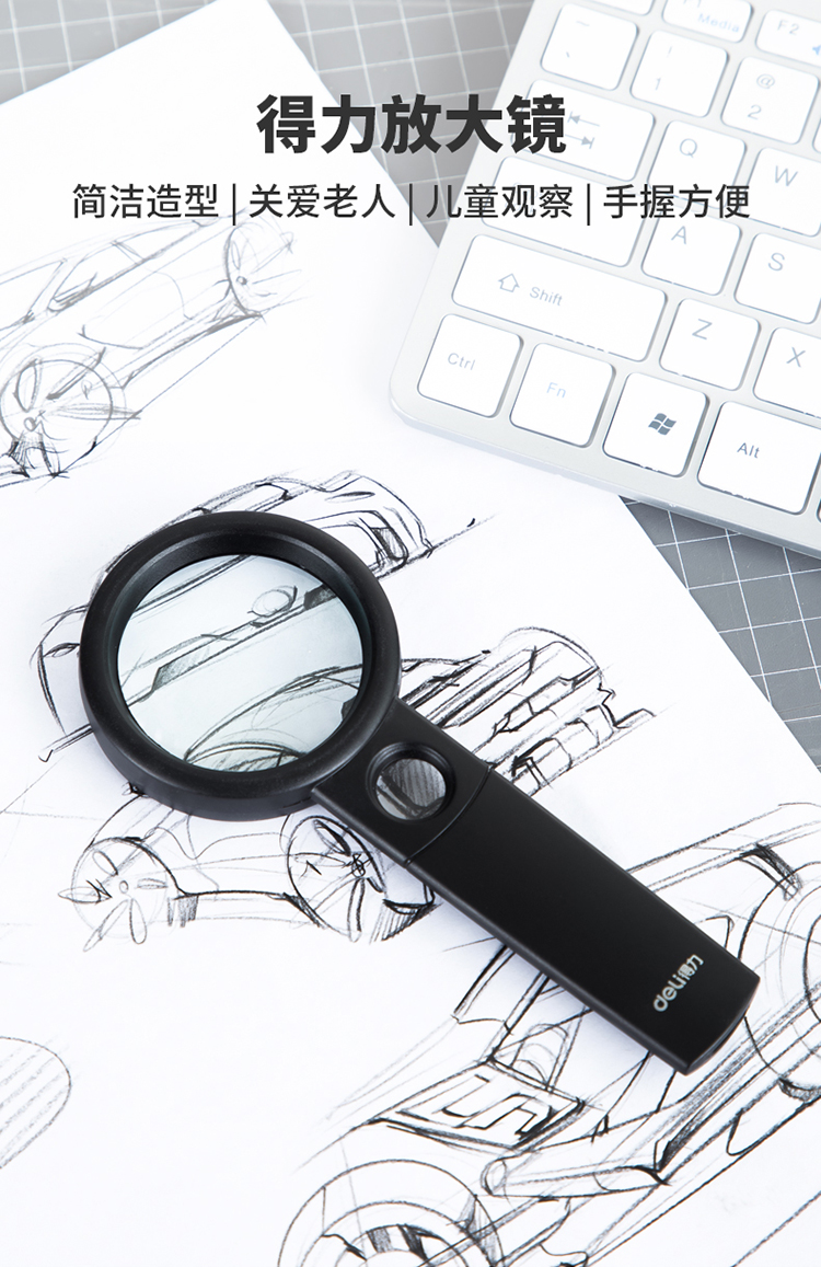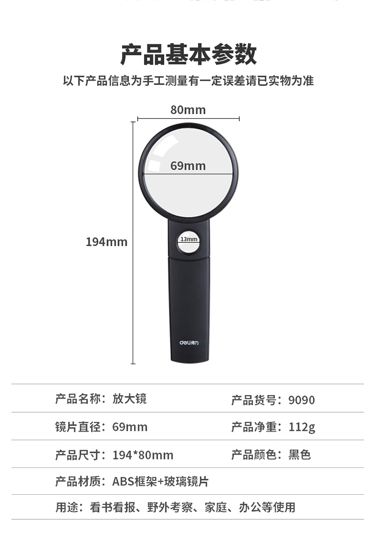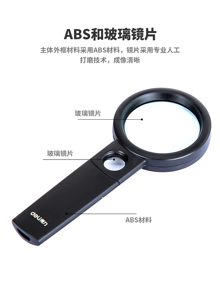 商品名称:得力(deli)Ф70mm手持高清阅读放大镜(带辅助放大镜) 9090