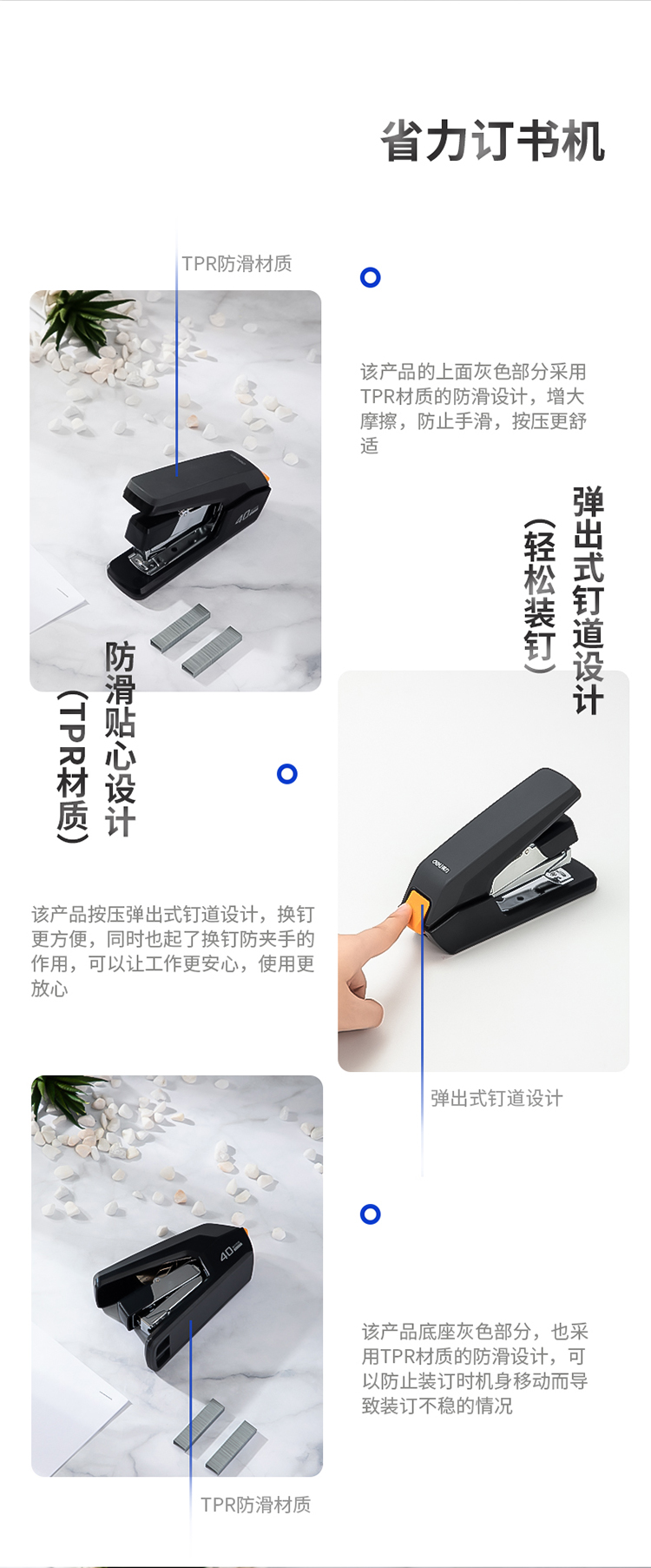 商品名称:得力(deli)省力型订书机 可订40页80g 适配24/6,26/6及24/8订书钉 0371 颜色随机