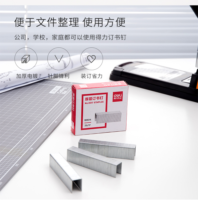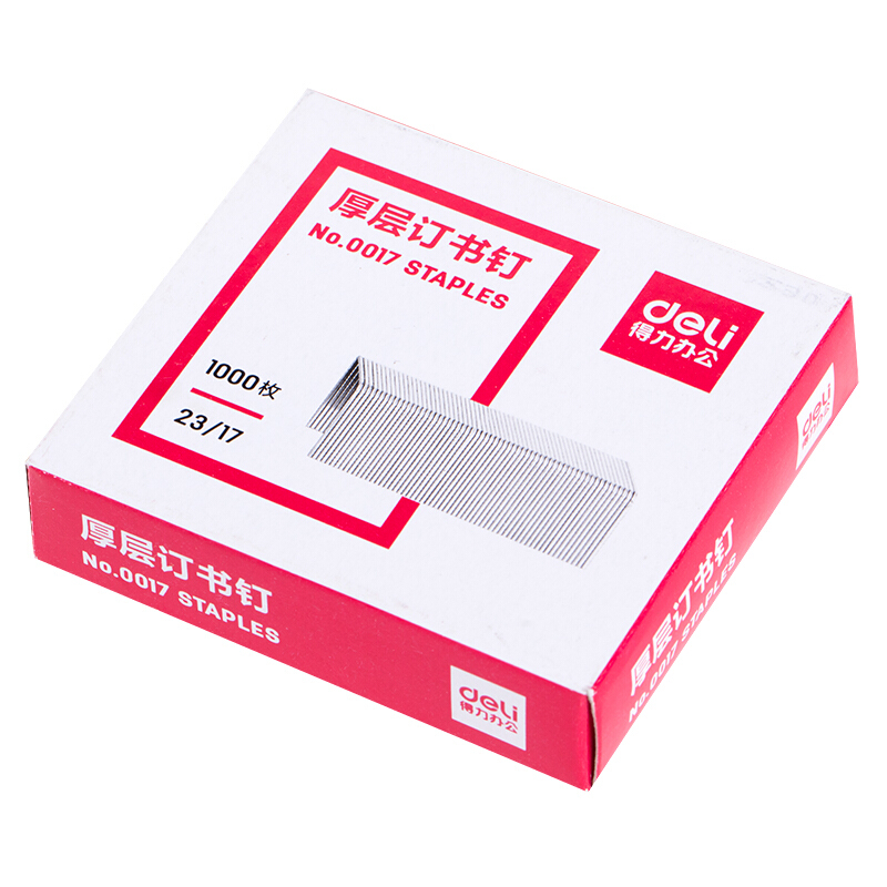 商品名称:得力(deli)0017重型厚层大订书钉订书针23/17 可订120页 (单位:盒)