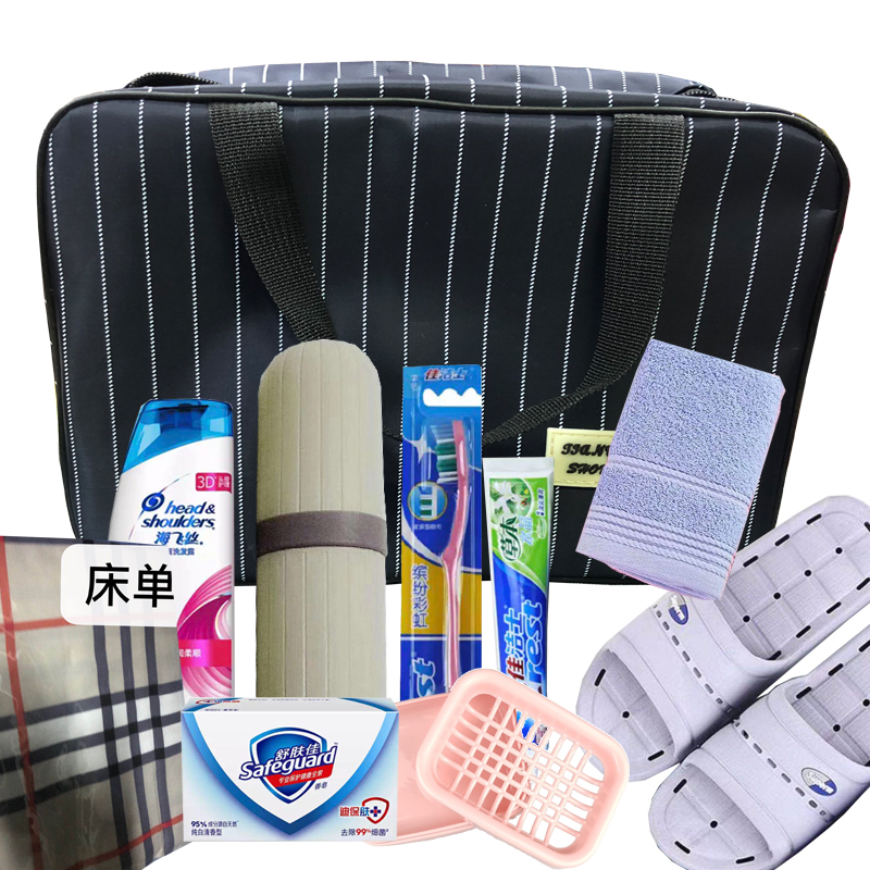 洗漱包套装 十件套含:牙膏/牙刷/牙缸/洗发水/香皂/香皂盒/毛巾/拖鞋/洗漱包/床单(套内单品款式随机)