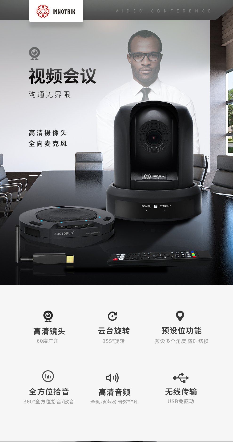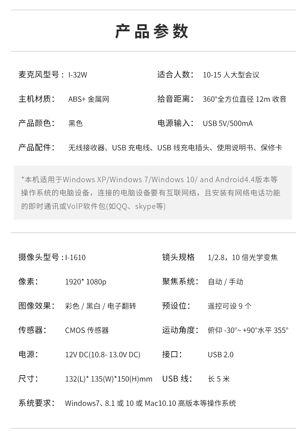 商品名称:音络 I-B21 中大型视频会议室解决方案(音络会议摄像头I-1610+无线全向麦克风I-32W)