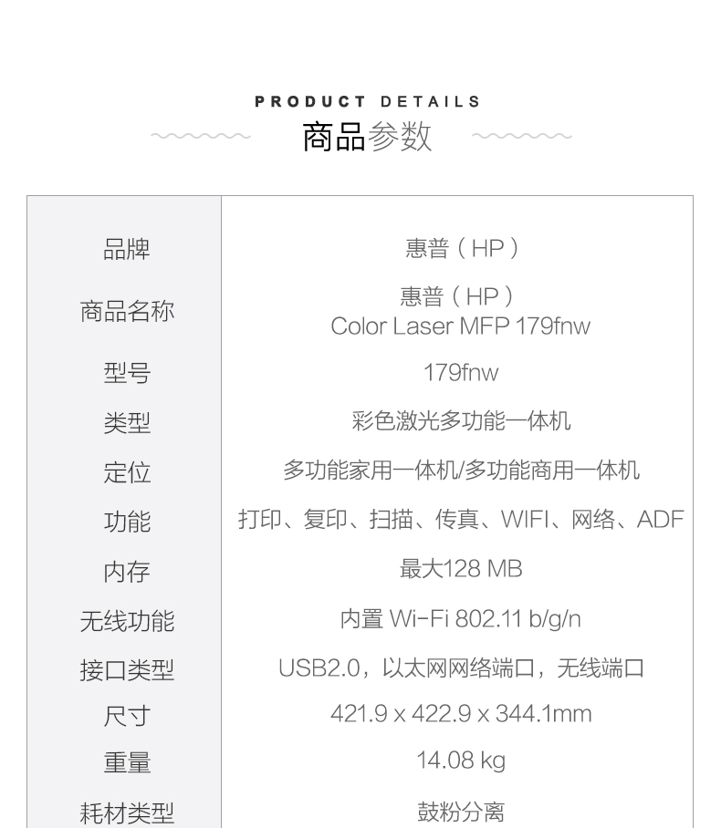商品名称:惠普(HP) M179fnw打印机A4彩色激光多功能一体机