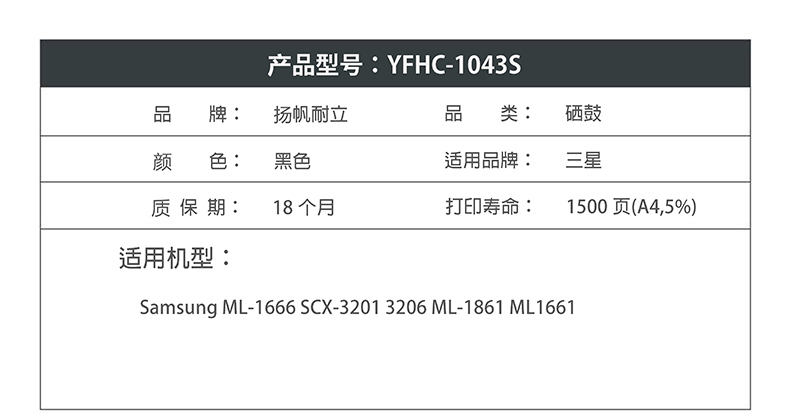 商品名称:扬帆耐立YFHC SX-1043S黑鼓(带芯片) 适用机型:Samsung ML-1666 SCX-3201 3206 ML-1861 ML1661