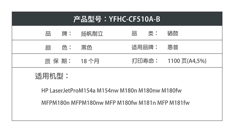 商品名称:扬帆耐立YFHC CF510A(204A)黑鼓-1.1K(带芯片) 适用于:HP LaserJetProM154a M154nw M180n M180nw M180fw MFPM180n MFPM180nw MFP M180fw M181n