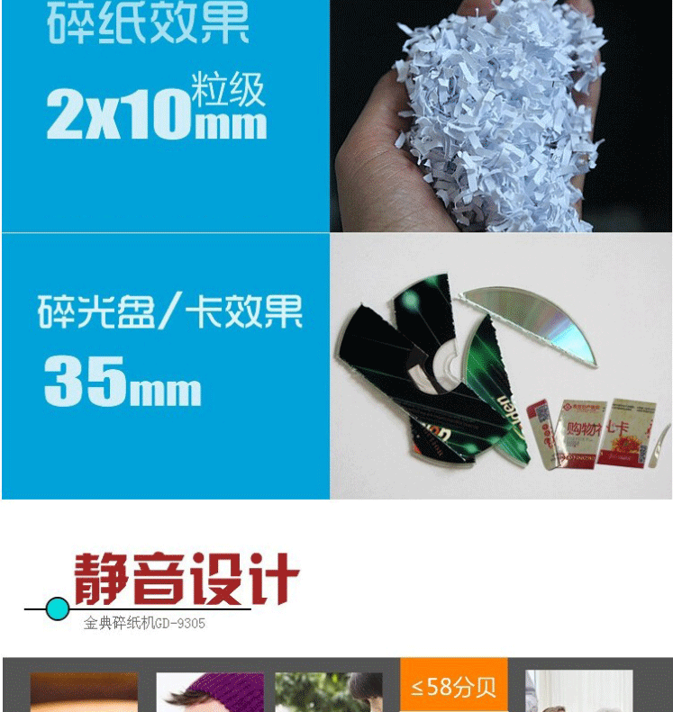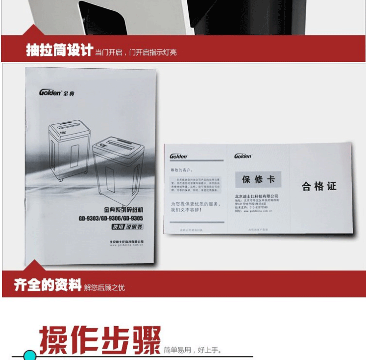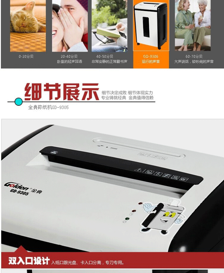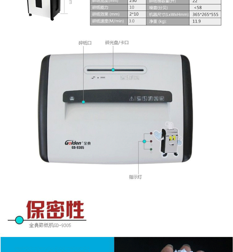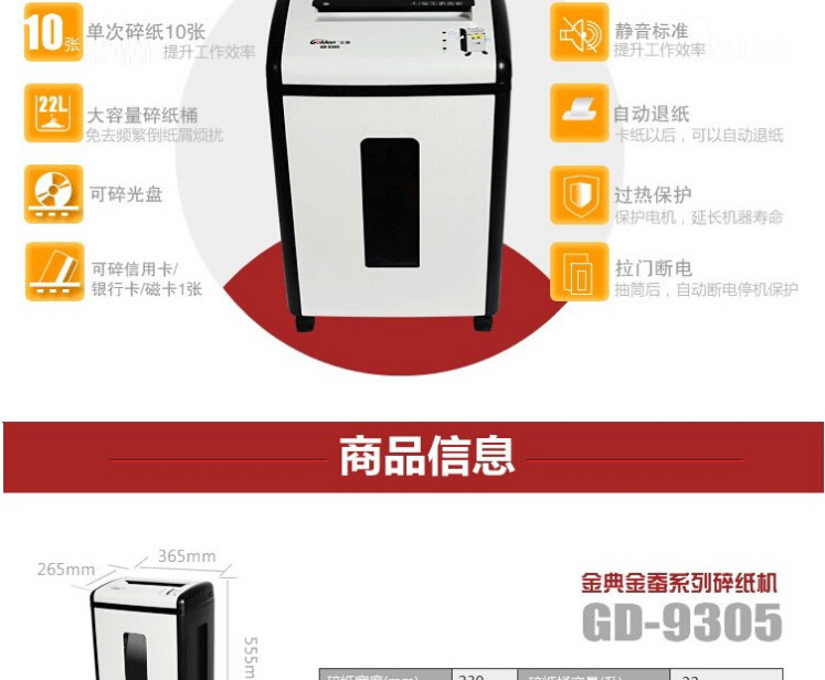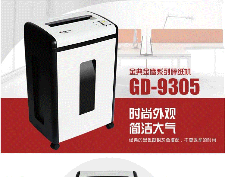 商品名称:金典(GOLDEN) 商用办公碎纸机 4级保密电动家用粉碎机 可碎纸/信用卡/CD 新款碎纸机GD-9305
