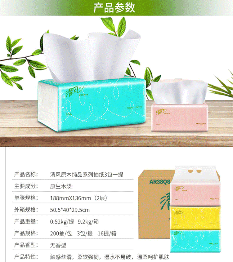 商品名称:清风原木抽纸BR38AC面纸餐巾纸卫生纸擦手纸巾200抽/包 48包/箱(单位:装)