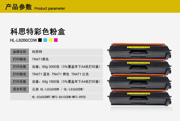 商品名称:科思特 TN471(粉盒)(黄) 适用兄弟 MFC-L8900CDW/HL-L9310CDW/HL-L8260CDN 专业版