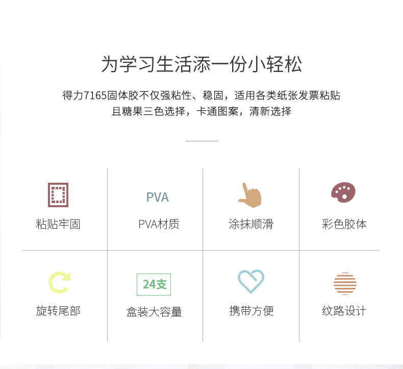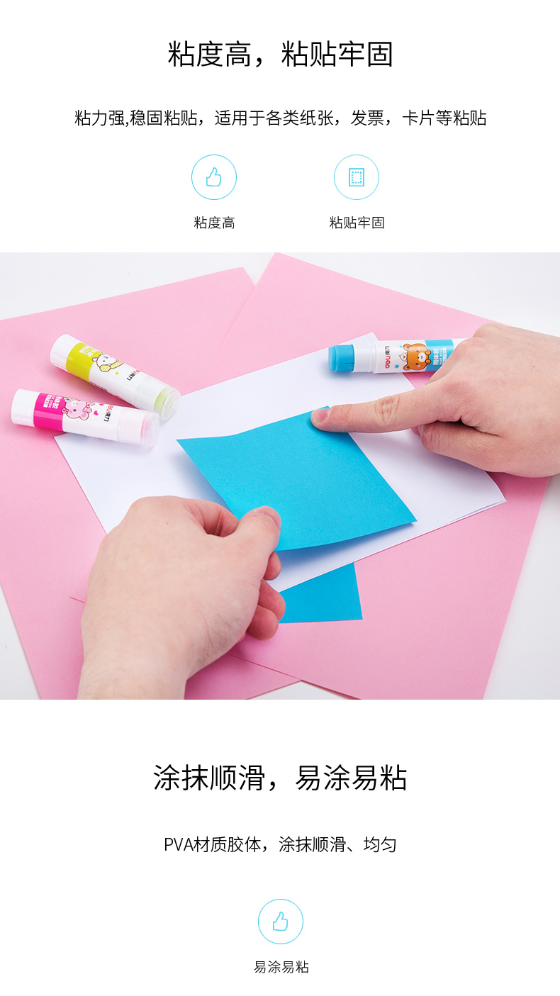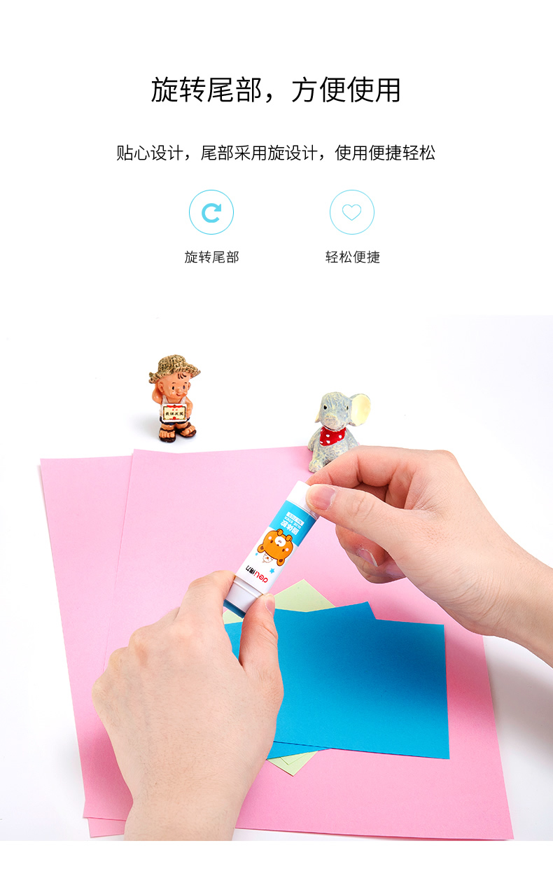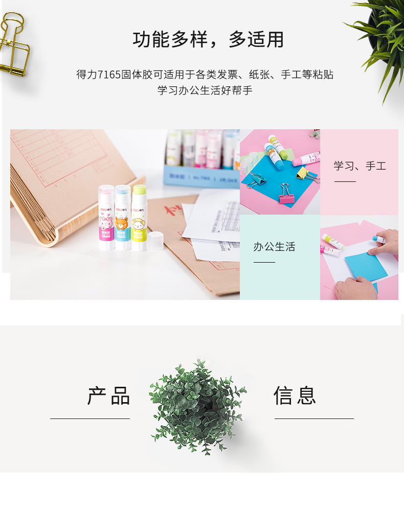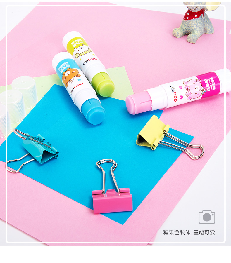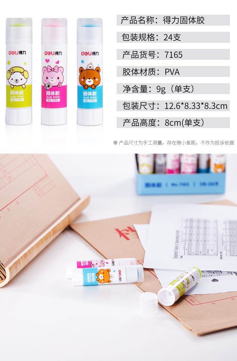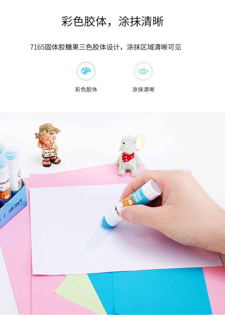 商品名称:得力文具7165无甲醛安全环保固体胶 9g 混色装 (单位:支 颜色随机)