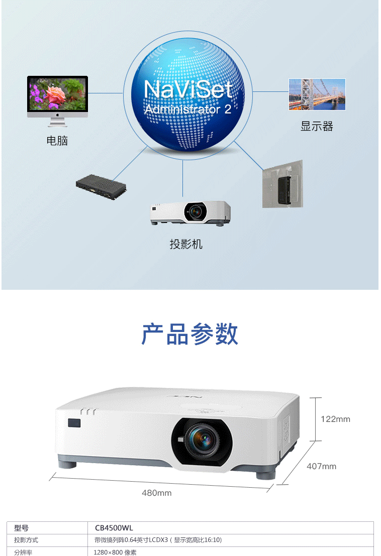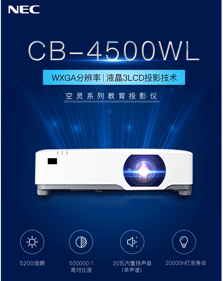 商品名称:NEC NP-CB4500WL投影仪 投影机 商用 办公(5200流明 激光光源 WXGA分辨率兼容4K)