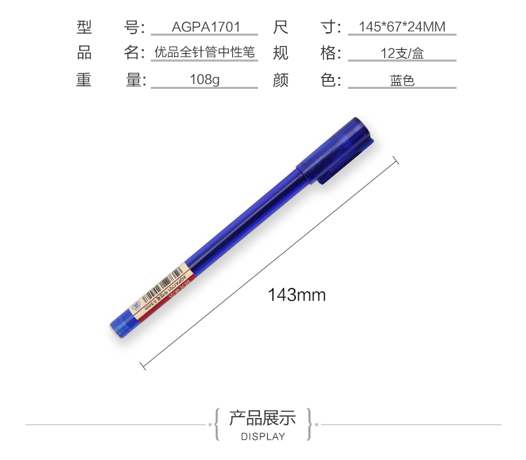 商品名称:晨光中性笔优品AGPA1701蓝0.5 12支/盒