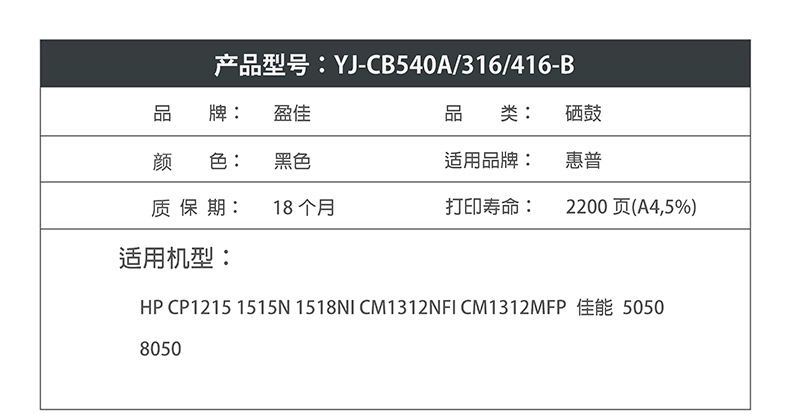 商品名称:盈佳YJ CB540A(125A)/316/416黑色硒鼓(带芯片) 适用于:HP CP1215 1515N 1518NI CM1312NFI CM1312MFP 佳能 5050 8050