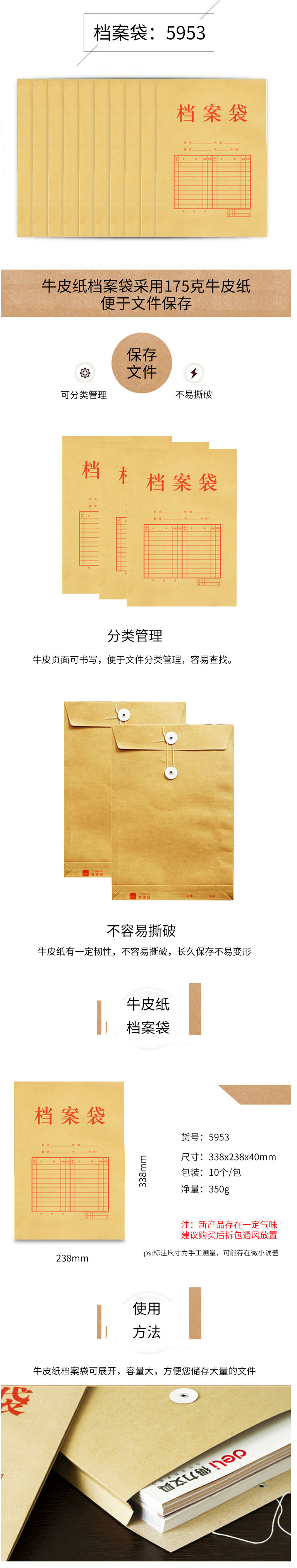商品名称:得力(deli) 5953 混浆牛皮纸档案袋 A4 175g侧宽4cm 文件资料袋 10只/包