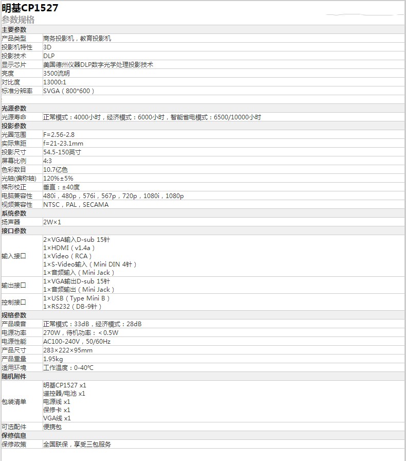 商品名称:明基(BenQ)CP1527投影仪办公商务 高亮3500流明HDMI高清投影机 官方标配