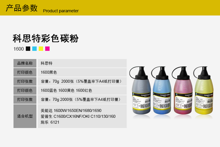 商品名称:科思特 1600(70G)碳粉 BK 适用柯尼卡美能达 1600W/1650EN/1680/1690 Epson C1600/CX16NF OKI C110/130/160 Xerox 6121专业版