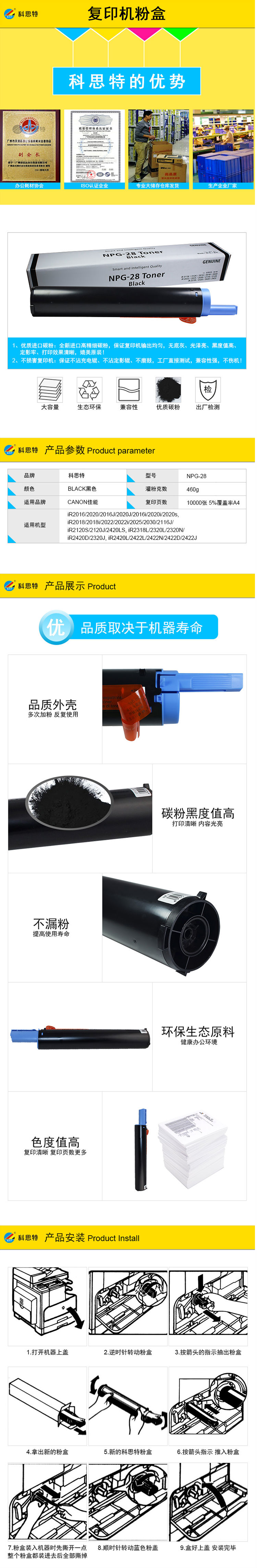 商品名称:科思特 NPG-28粉盒 适用佳能iR2016/2016J/2020i/2020s,iR2018/2018i/iR2120S iR2318L/2320L iR2420L/2422D/2422J 黑色