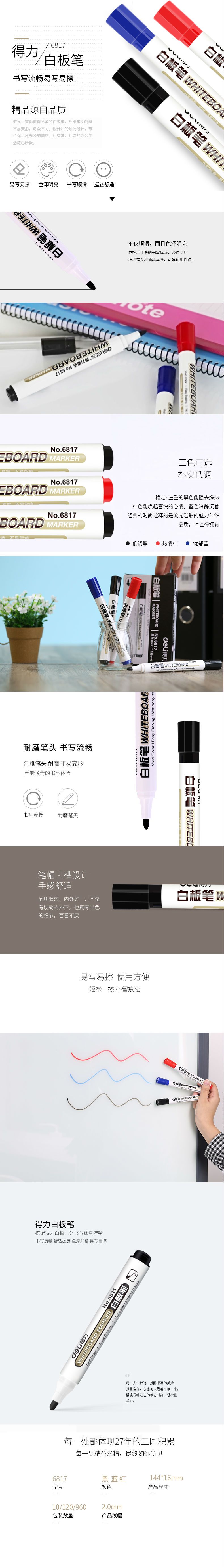 商品名称:得力(deli) 6817 优逸白板笔 色泽明亮可擦易擦 黑色 (单位:支)