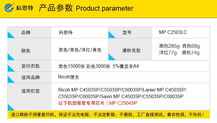 商品名称:科思特MP C2503LC粉盒 小容量 适用理光MP C2003SP/C2011SP/2503SP/Lanier MP C2003SP/2503SP(基士得耶 DSC1120 专用芯片) 蓝色