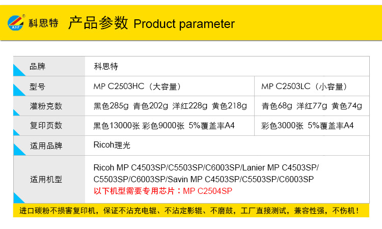 商品名称:科思特MP C2503HC粉盒 大容量 适用理光MP C2003SP/C2011SP/2503SP/Lanier MP C2003SP/2503SP(基士得耶 DSC1120 专用芯片) 黑色