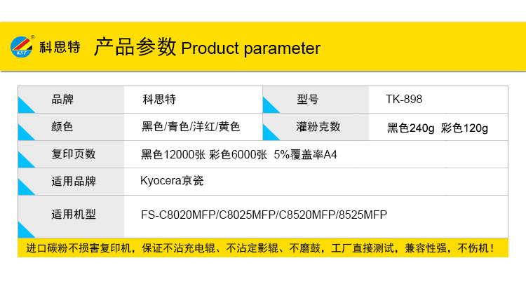 商品名称:科思特 TK-898K(带芯片) 粉盒 适用京瓷FS-C8020MFP/C8025MFP/C8520MFP/8525MFP 黑色
