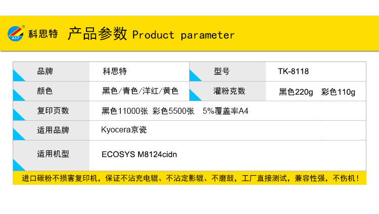 商品名称:科思特 TK-8118K(带芯片) 粉盒 适用京瓷ECOSYS M8124cidn 黑色