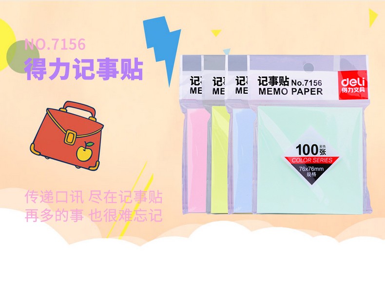 商品名称:得力(deli) 7156便利贴 标签纸 便签纸 记事贴76*76mm 颜色随机(单位:包)