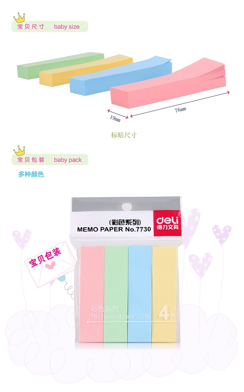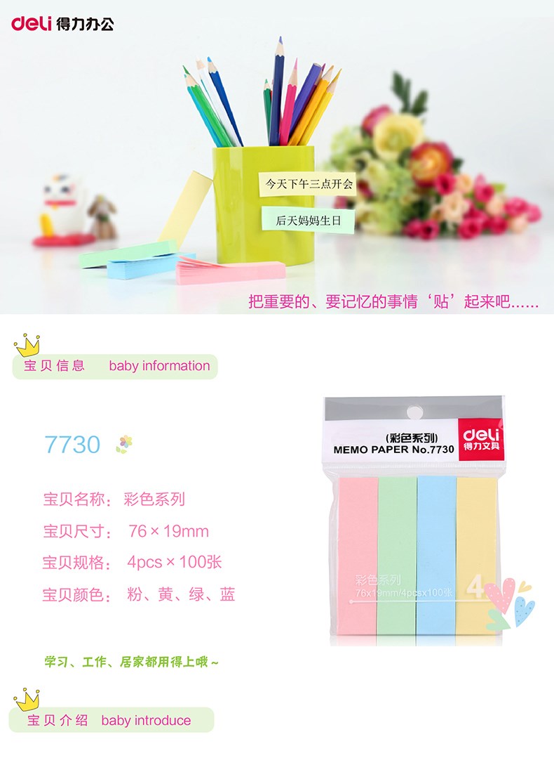 商品名称:得力7730彩色便利贴 得力四色记事贴 76*19mm (单位:包)